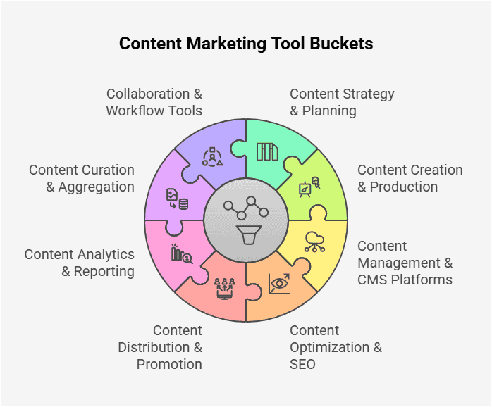 Each of these buckets supports a different part of your content marketing ecosystem. Depending on your team size, budget, and specific goals, you might choose specialized tools in each area or opt for platforms that offer an integrated solution. The key is to ensure that your tools help streamline processes from ideation to measurement, ultimately making your content more effective and easier to manage.